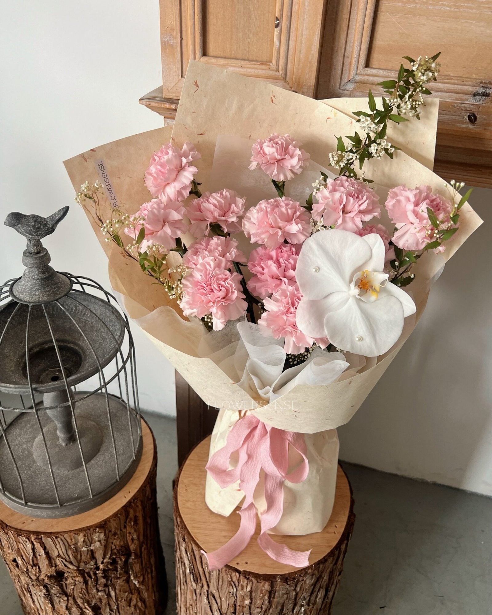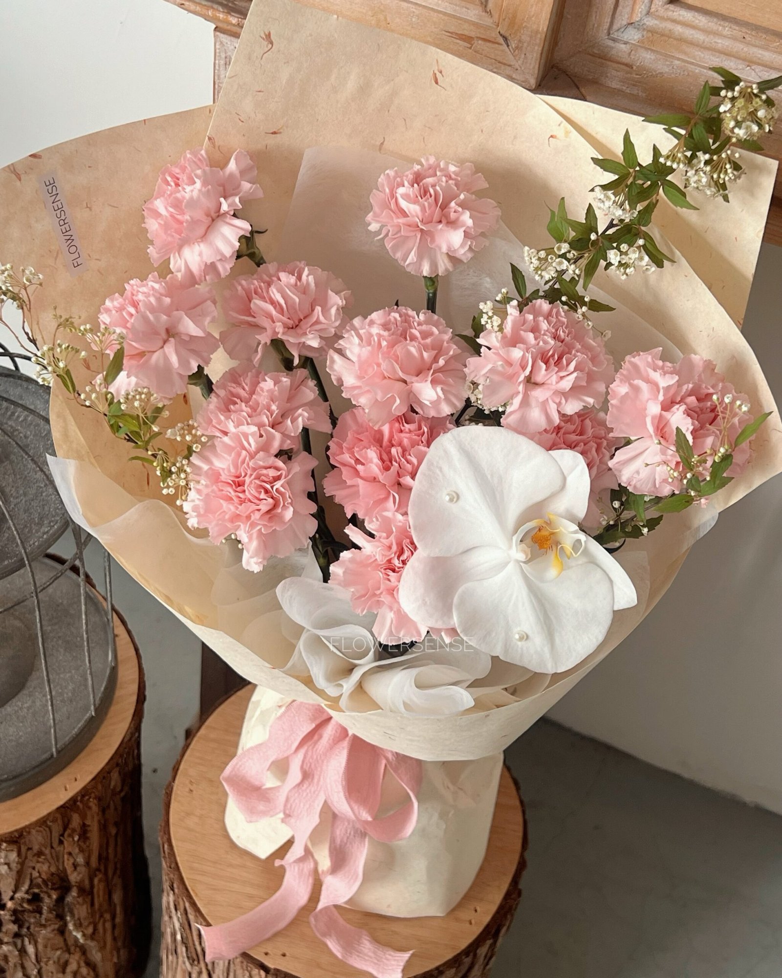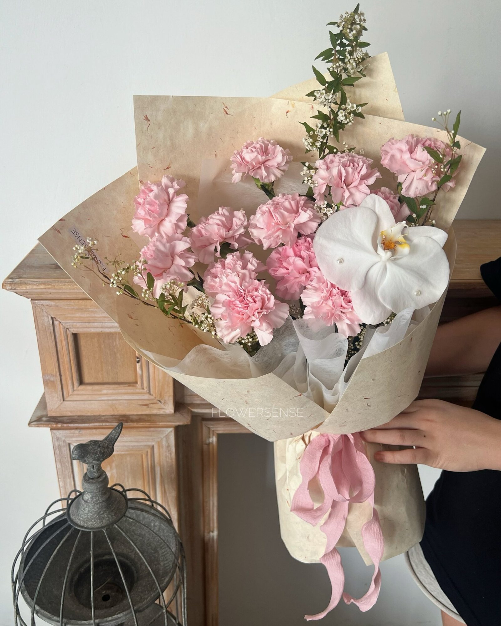 12 stems of imported carnations, Phalaenopsis cut , & Spiraea.